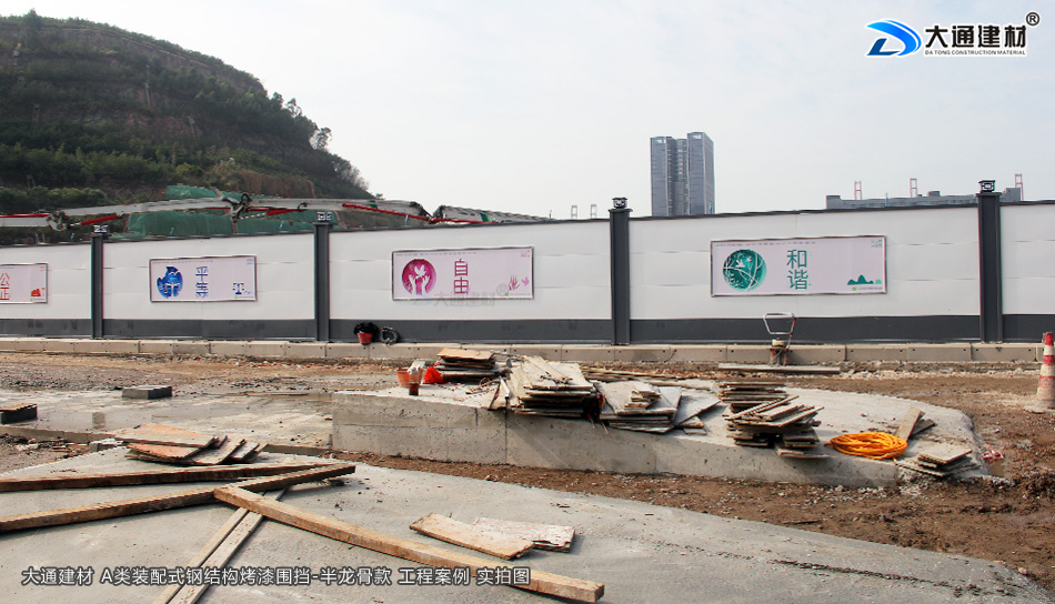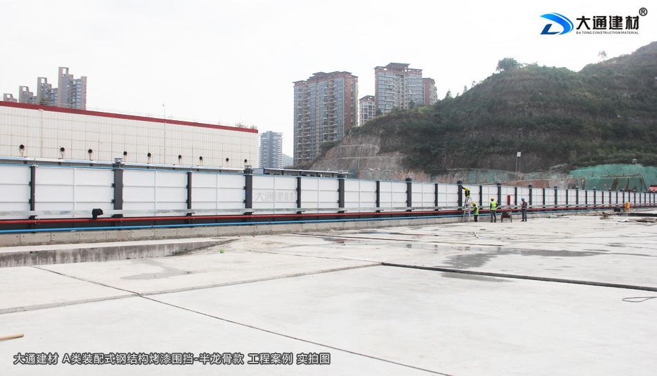 大通建材A類(lèi)烤漆鋼圍擋-半龍骨款,是一款新型裝配式鋼結(jié)構(gòu)圍擋,圍擋的上下橫梁均為50x50mm深灰色烤漆方通,立柱為300x200mm深灰色烤漆矩形方鋼,2.5米高的每一擋圍擋有8塊(6塊白色、2塊深灰色)烤漆墻板,由左右兩塊墻板與中間暗柱、左右立柱連接組成,安裝得當(dāng)可以防御10級(jí)以上的臺(tái)風(fēng)。了解更多“大通建材A類(lèi)烤漆鋼圍擋-半龍骨款”的定制生產(chǎn)、配送安裝、價(jià)格與規(guī)格等詳情,請(qǐng)直接致電13826562448梁先生 進(jìn)行溝通