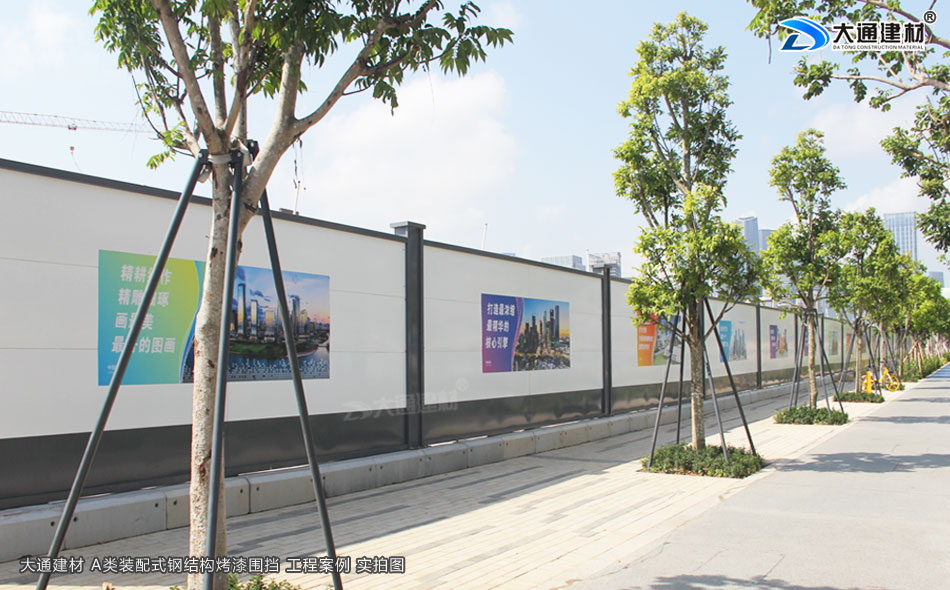 大通建材A類裝配式鋼圍擋,堅持深圳質量,關注城市美學,培育精益求精的工匠精神,結合深圳開放、創新、現代、濱海的城市的特征和公益宣傳的要求。提供具備不同區域環境特點的外觀設計方案,外觀顏色可以是白色+深灰色烤漆擋板(亦可是全白色烤漆擋板),美觀大氣的現代風格; 再結合城市區域特點,分片區、分道路、分街景各自選用同類風格圍擋,營造美觀、整潔的城市環境的同時,實現圍擋風格區域性的協調統一。