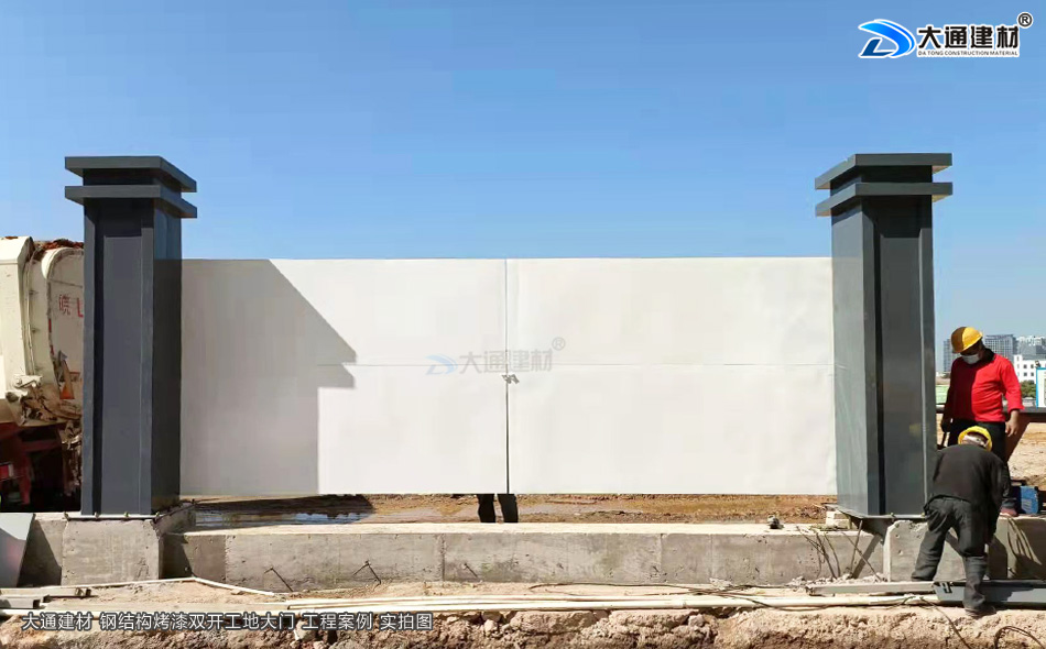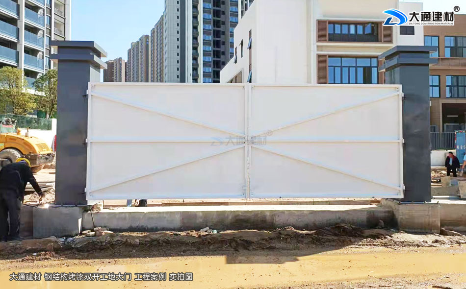 這個工程工地采用的是深圳大通建材生產的項目施工現場新款鋼結構烤漆工地大門,白色烤漆鋼材制作,雙開門加兩根霸氣大立柱,整個大門看起來很有氣勢吧。