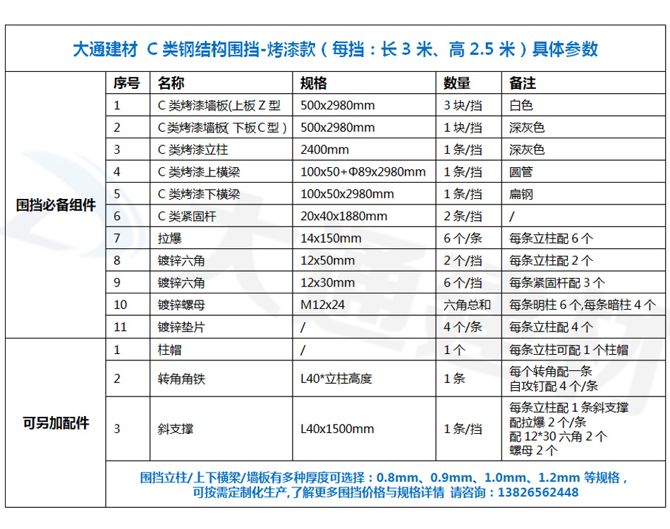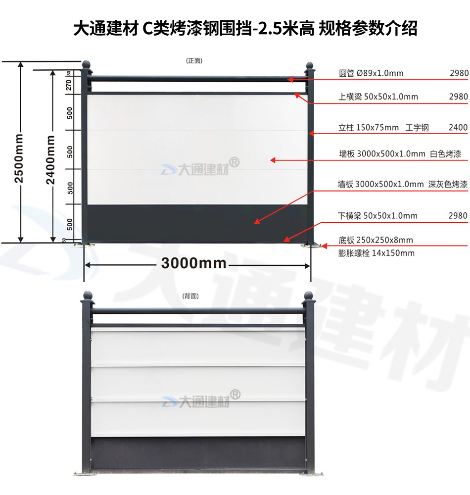 大通建材 C類裝配式鋼圍擋-烤漆款的烤漆鋼板厚度是1.0mm,采用150*75mm工字鋼深灰色烤漆立柱,同時每一擋圍擋的長度是3m,高度是2.5m,其它具體參數(shù)規(guī)格請參照上述展示的圍擋參數(shù)圖。