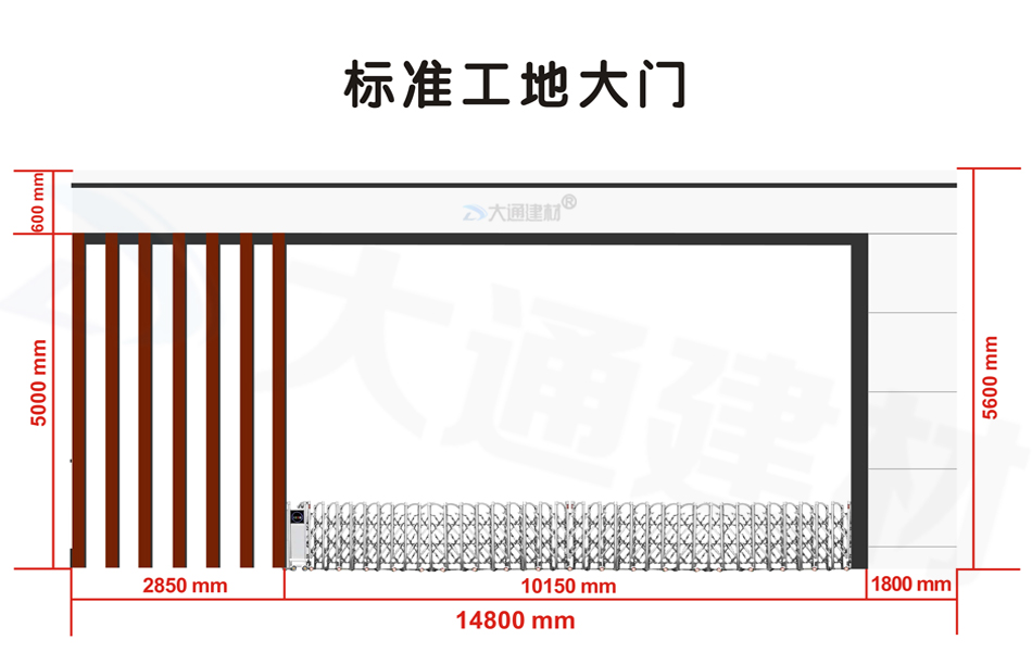 (每款工地大門正常的尺寸是:14.8米寬*5.6米高,其它尺寸 可以按工地具體的實際需求定制化生產)