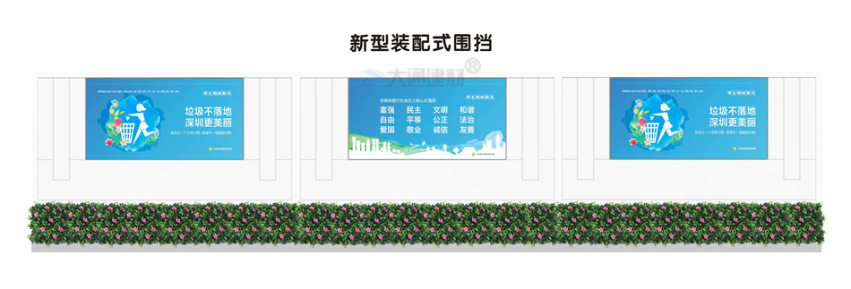 深圳市大通建材生產的 新型裝配式圍擋+高檔綠植圍擋 符合深圳市住建局統一要求的圍擋標準,常規尺寸的圍擋有現貨,而對圍擋尺寸、顏色等有特殊要求的可按實際需求定制化生產,了解更多“大通圍擋規格與價格”的詳情請致電咨詢 13826562448 梁先生