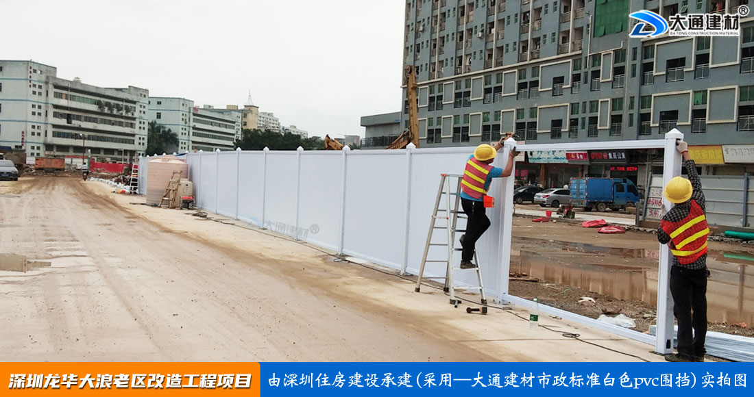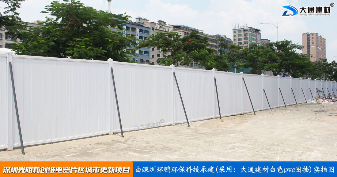 深圳市大通建材生產批發PVC圍擋符合市政標準,這款圍擋的圍墻板面采用PVC長條版拼接,立柱、橫管均為PVC材料,內部均襯方通。立柱底板為鋼板,并加斜撐受力。大通建材常規款PVC圍擋尺寸長3mx高2.5m、長3mx高2.2m、長3mx高2.0m 其它PVC圍擋尺寸可按實際需要進行定制生產。