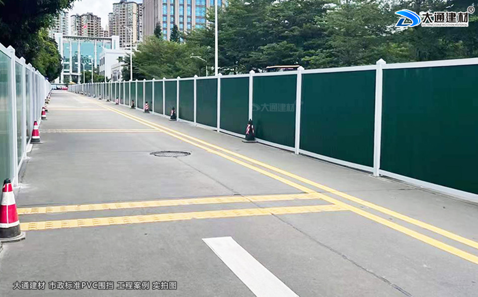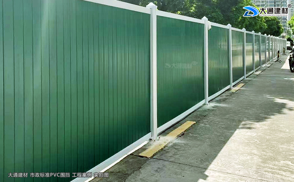 深圳大通建材綠色PVC圍擋表面經烤漆工藝噴涂、鮮艷的綠色、表面光滑,具有美觀環保、安全穩固、經久耐用等特點,適合市政道路建設施工、地產工程項目建設施工管網改造施工、路橋維護施工等工程選用。