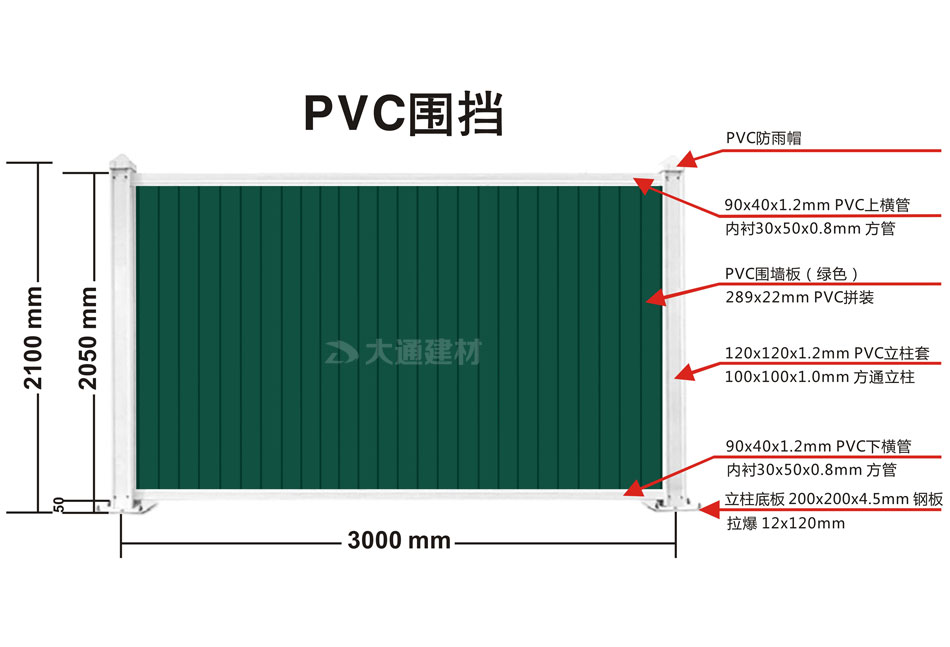 深圳市大通建材有限公司于2021年9月推出PVC圍擋系列新品-綠色PVC圍擋,大通新推出的綠色PVC圍擋與傳統PVC圍擋相比最大的區別是圍墻板的顏色,傳統款PVC圍擋的圍擋墻板是白色的,而新款的綠色PVC圍擋的圍墻板面采用綠色PVC長條版拼接,立柱、橫管均為白色PVC材料,內部均襯塑鋼方通,立柱底板為鋼板,并加斜支撐,增加受力,確保更安全穩固。